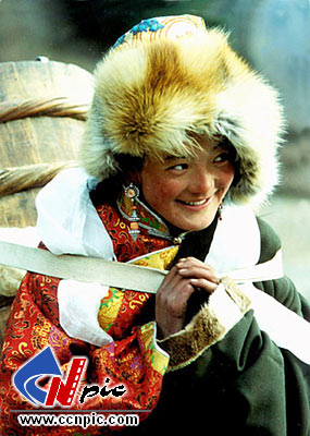 冬日里背水桶的藏族姑娘(摄影:刘成)